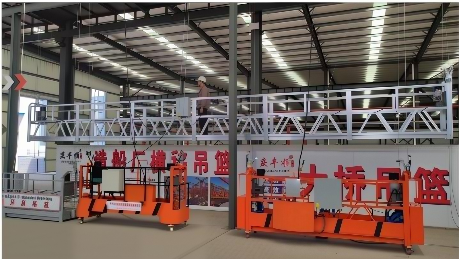 The main structure includes suspended mechanism, suspended platform, electric lifting system and safety protection device. According to the demand, you can choose two-end type or external type and other suspension methods. The hoist model is LTD1000, the safety lock model is LS30, and the wire rope model is 4×31WS-PP-9.1mm . Performance parameters: lifting speed of about 9-14 m/min, voltage of three-phase 380 V, rated frequency of 50 Hz, rated power of 2.2 kW × 2.